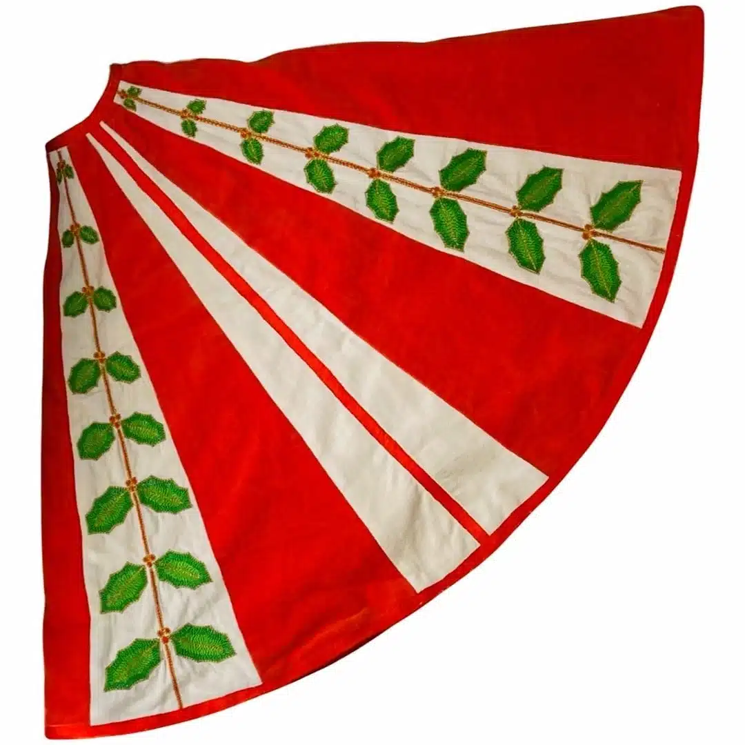 - Festive Red and White Peppermint Patterned Christmas Tree Skirt with Hand Embroidered Holly Berry Leaf Design Details