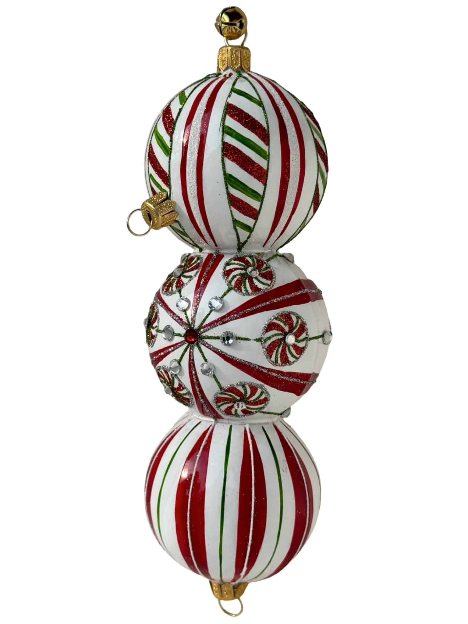 Unique Christmas Ball Trio with Red, White, and Green Peppermint Stripe Patterns
