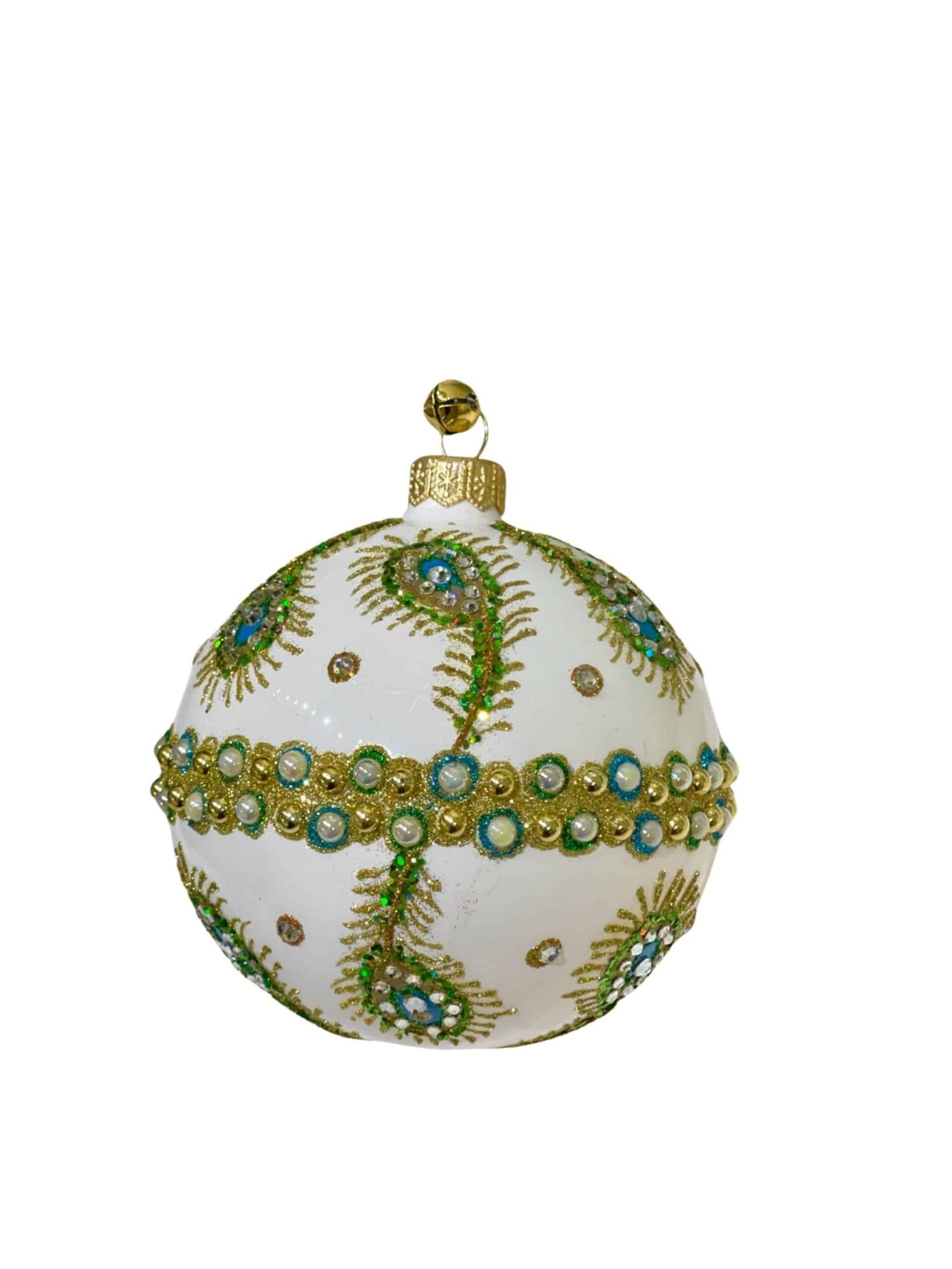 - Unique Exquisitely Hand Painted Blue, Green and Gold Glitter Peacock Feather Patterned Ball Christmas Tree Ornament