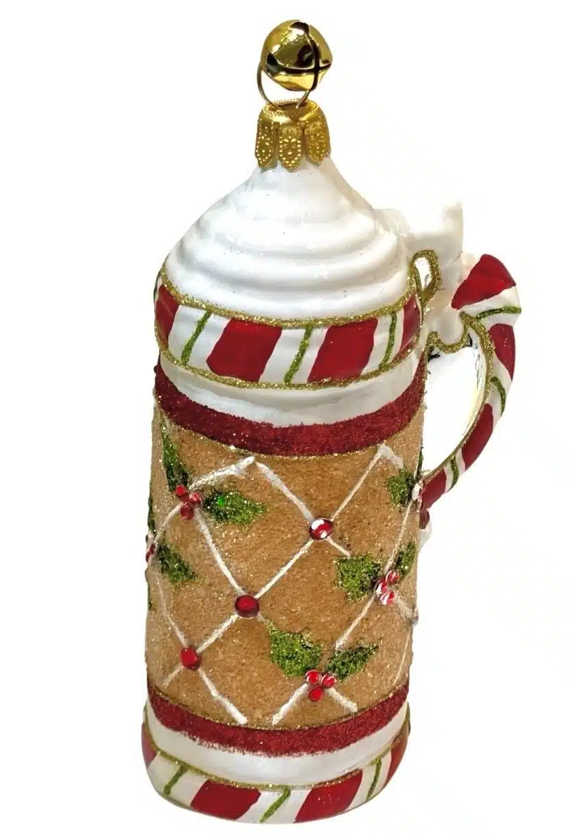 - Hand Painted Gingerbread and Holly Berry Leaf Patterned Beer Stein Christmas Ornament