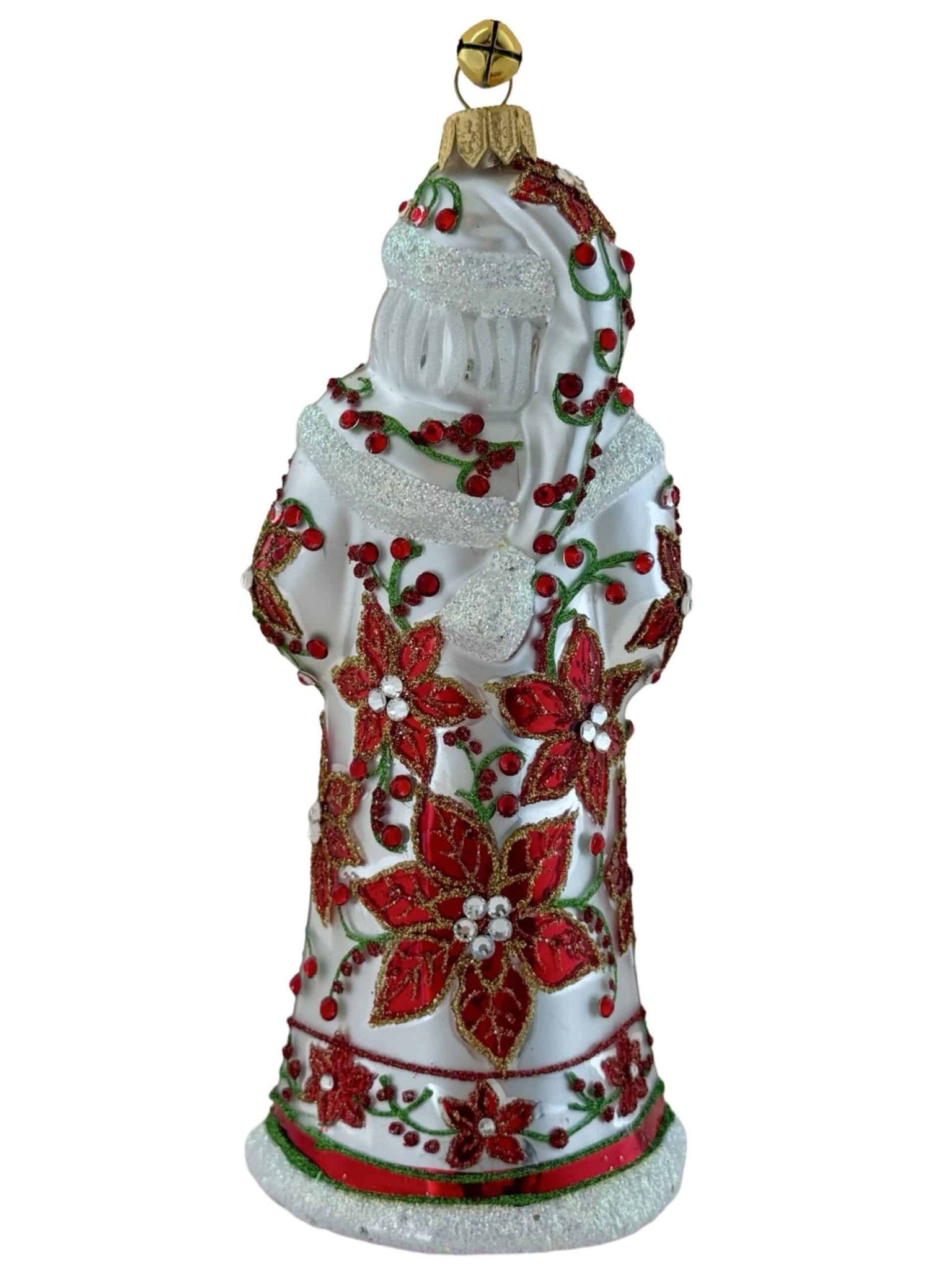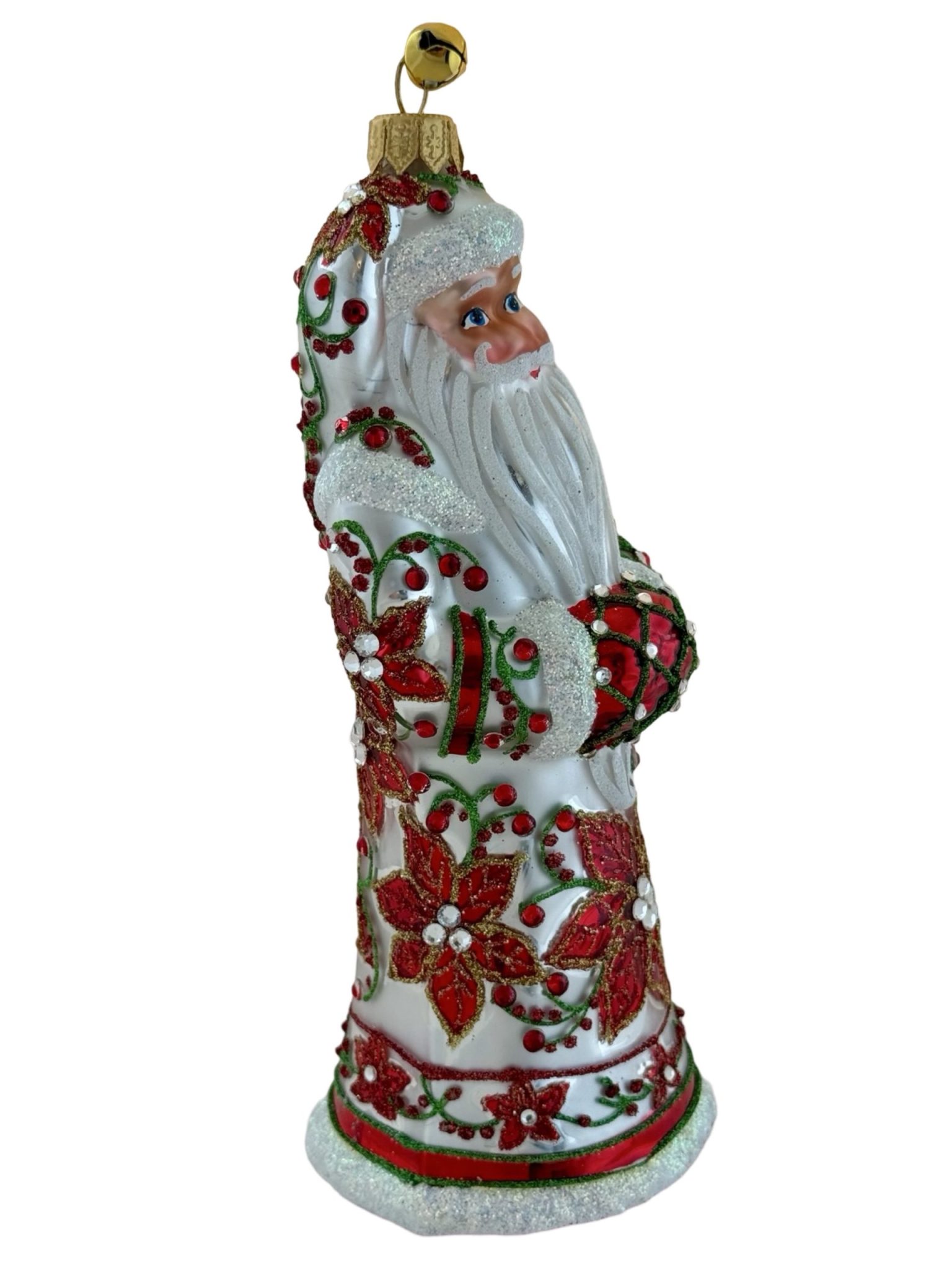 - Hand Painted Red Floral Poinsettia Patterned Silver Coat Santa Claus Ornament with Red Muffs
