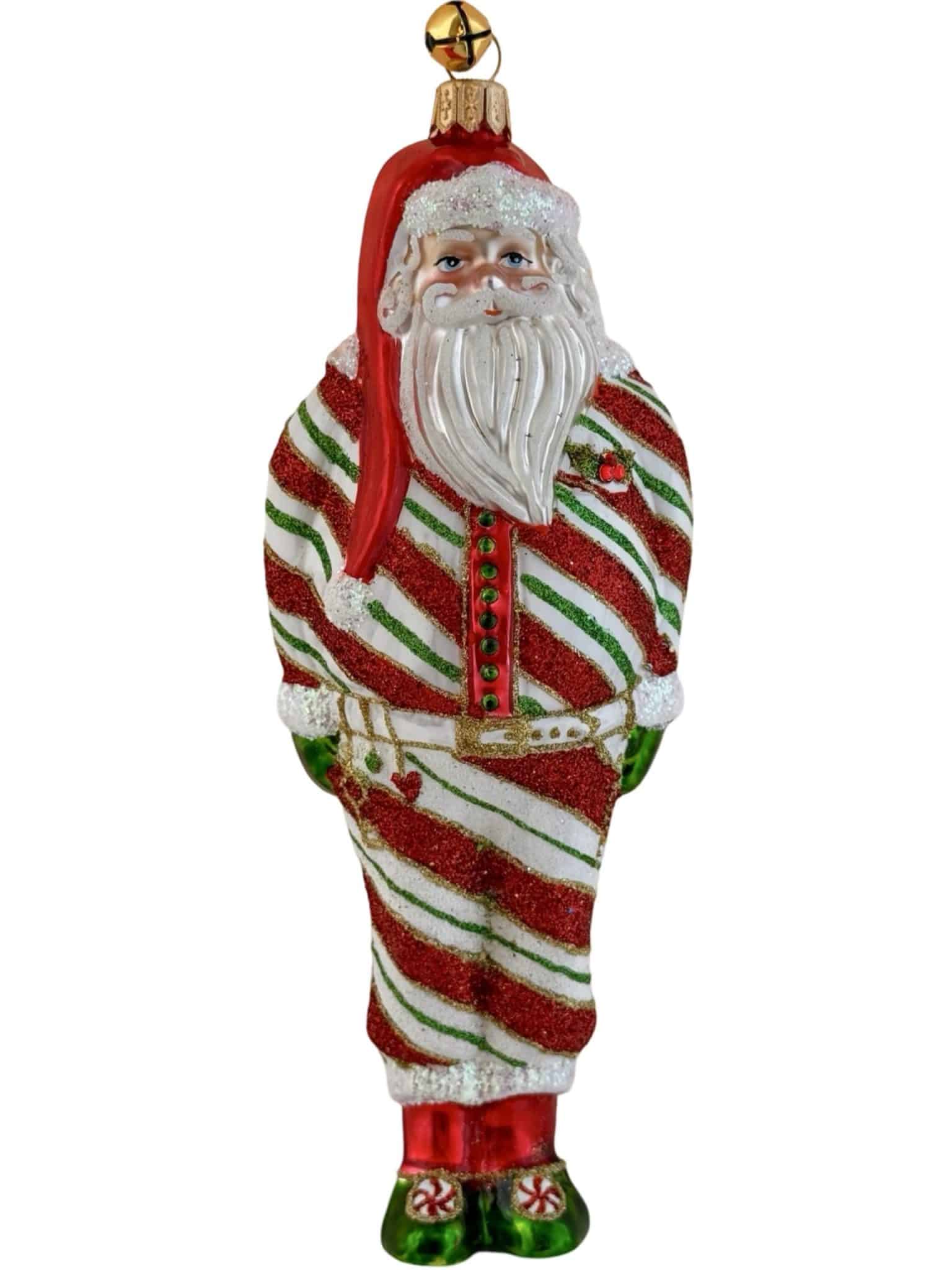 - Festive Santa Ornament Wearing Hand Painted Red and Green Glitter Stripe Holiday Pajamas with Peppermint Candy Slippers