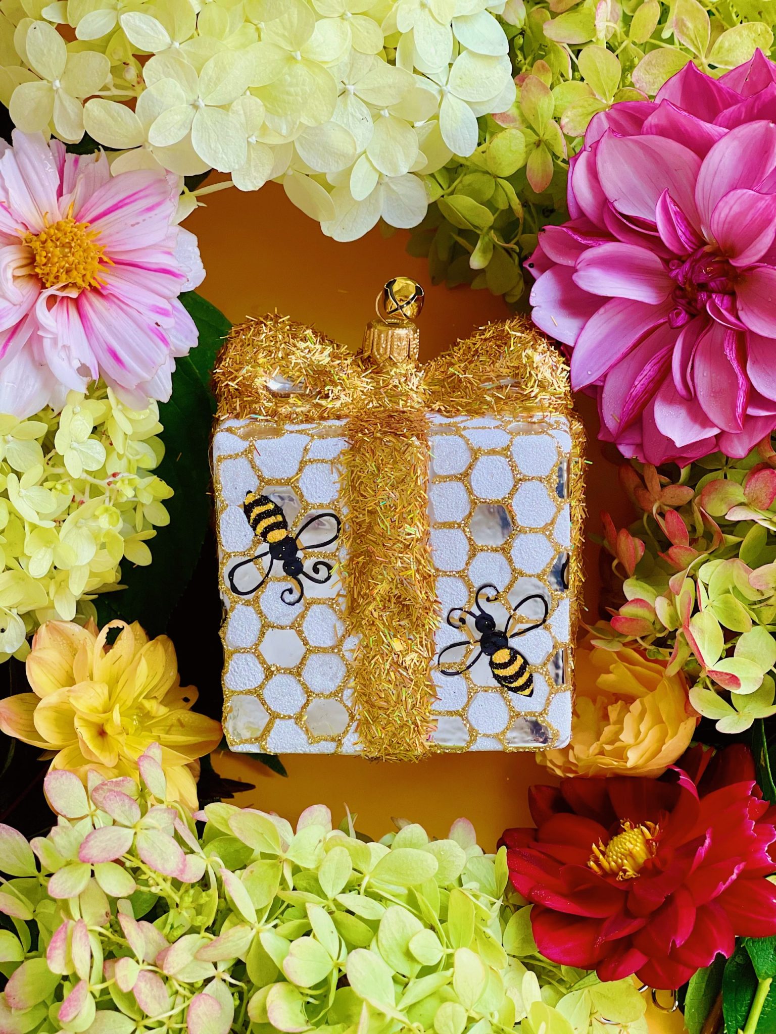 - Sterling Silver Lined Glass Bumble Bee and Honeycomb Patterned Present Ornament