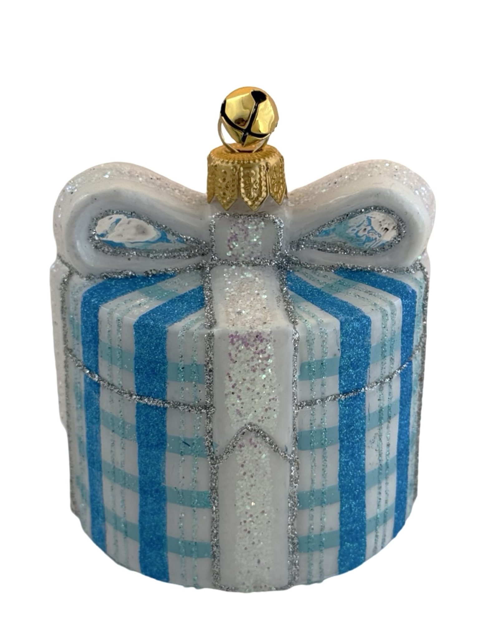 - Special Baby’s First Christmas Hand Painted Blue and White Plaid Patterned Gift Box Present Christmas Ornament