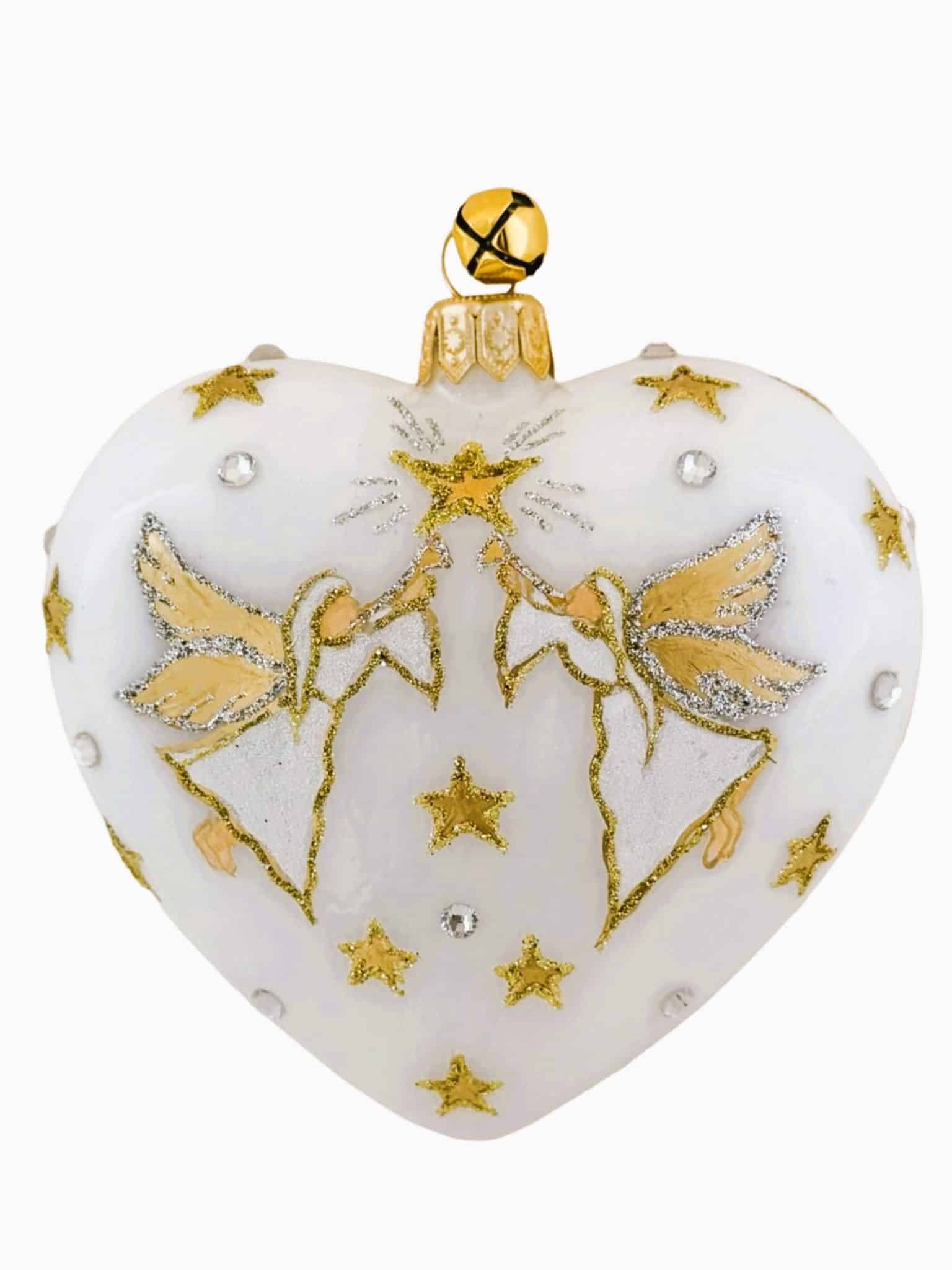 - Unique Limited Edition Collectible White Heart Ornament with Hand Painted Gold and Silver Glitter Angels