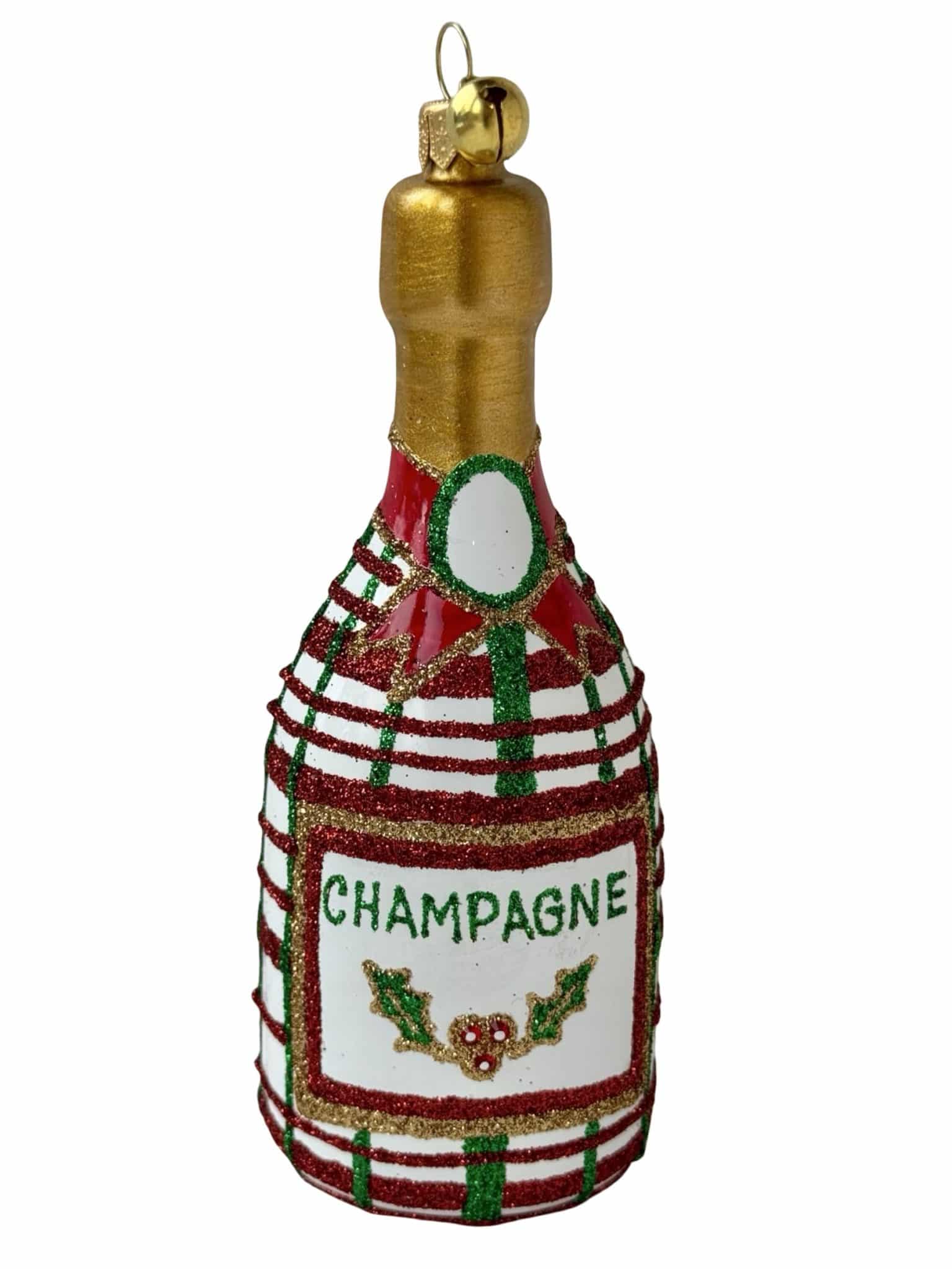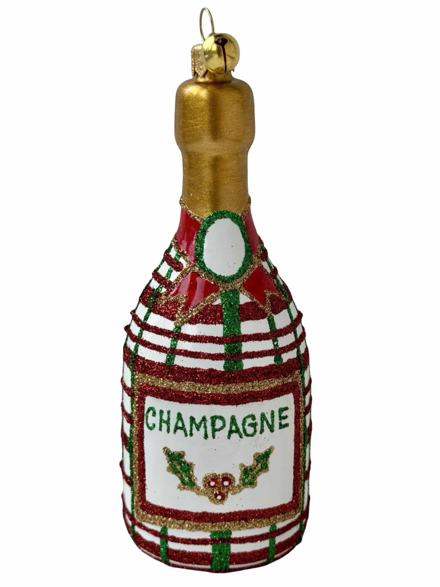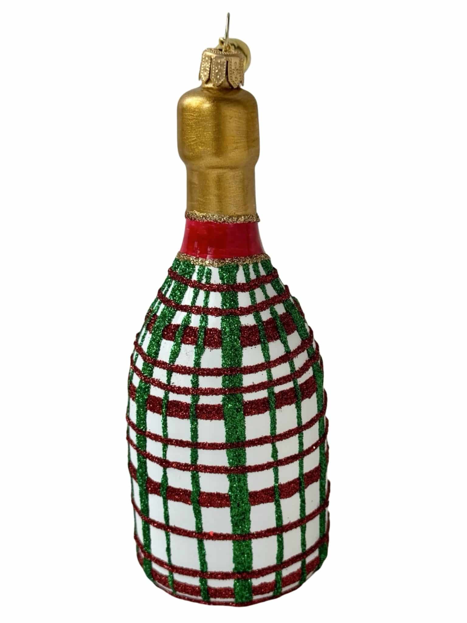 Red, White, and Green Christmas Plaid Pattern Champagne Bottle with Glitter Holly Berry Leaves on Label