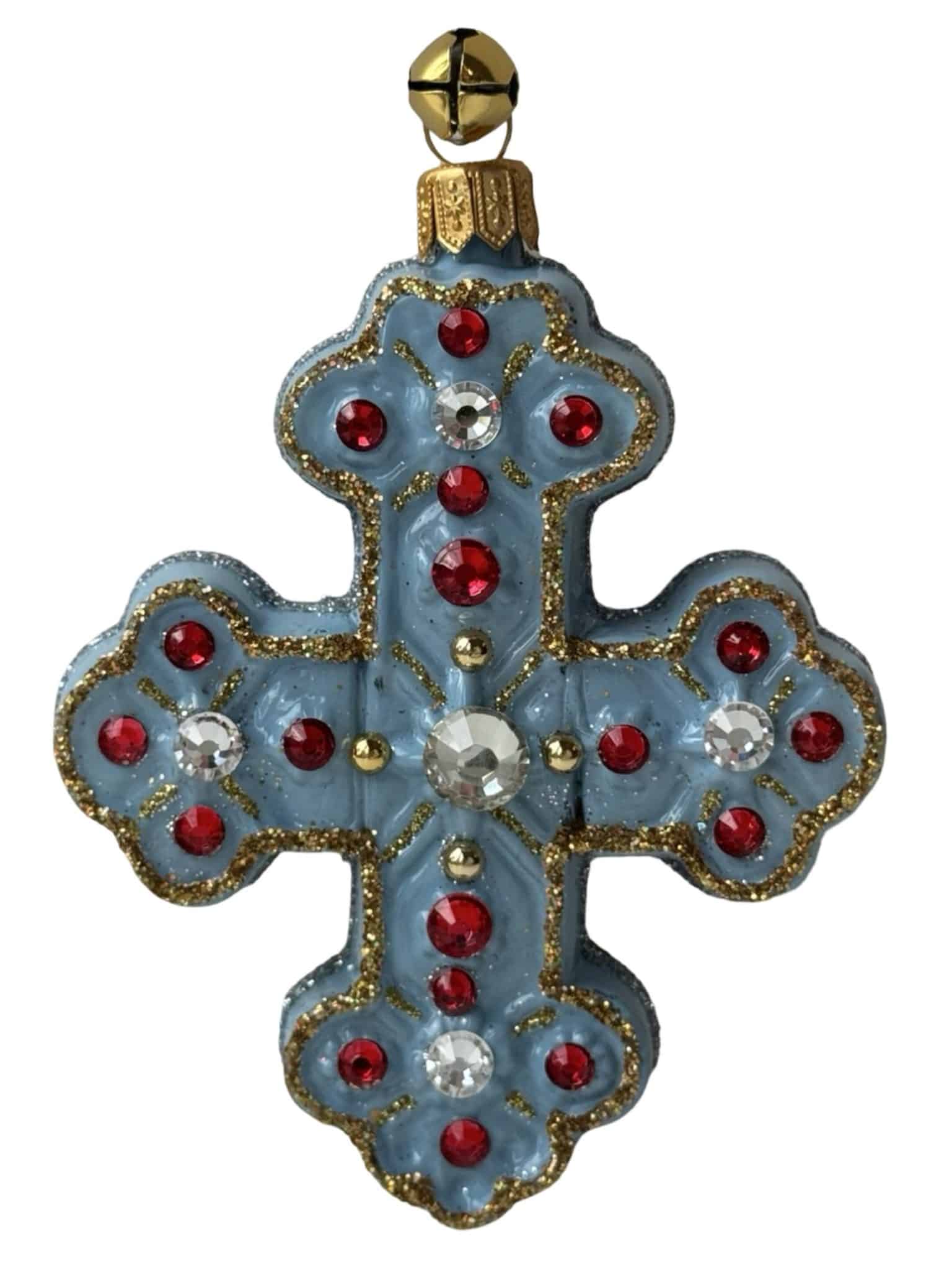Limited Edition Hand-Painted Blue Cross Ornament with Gold Glitter Accents, Trimmed with Czech Crystals