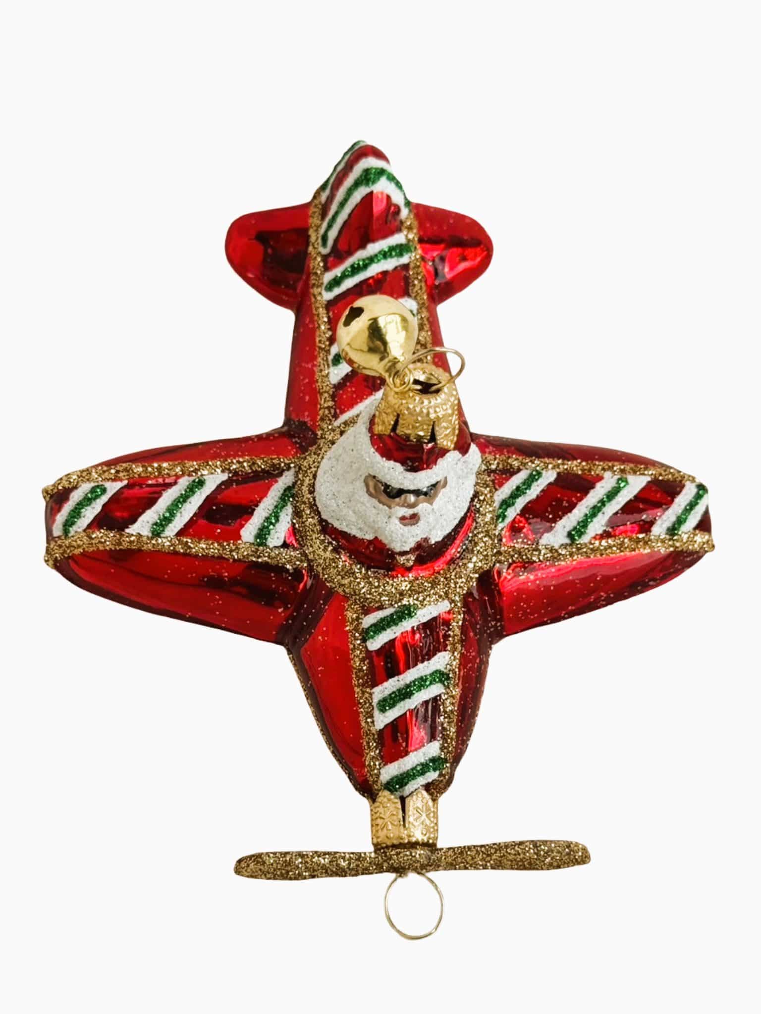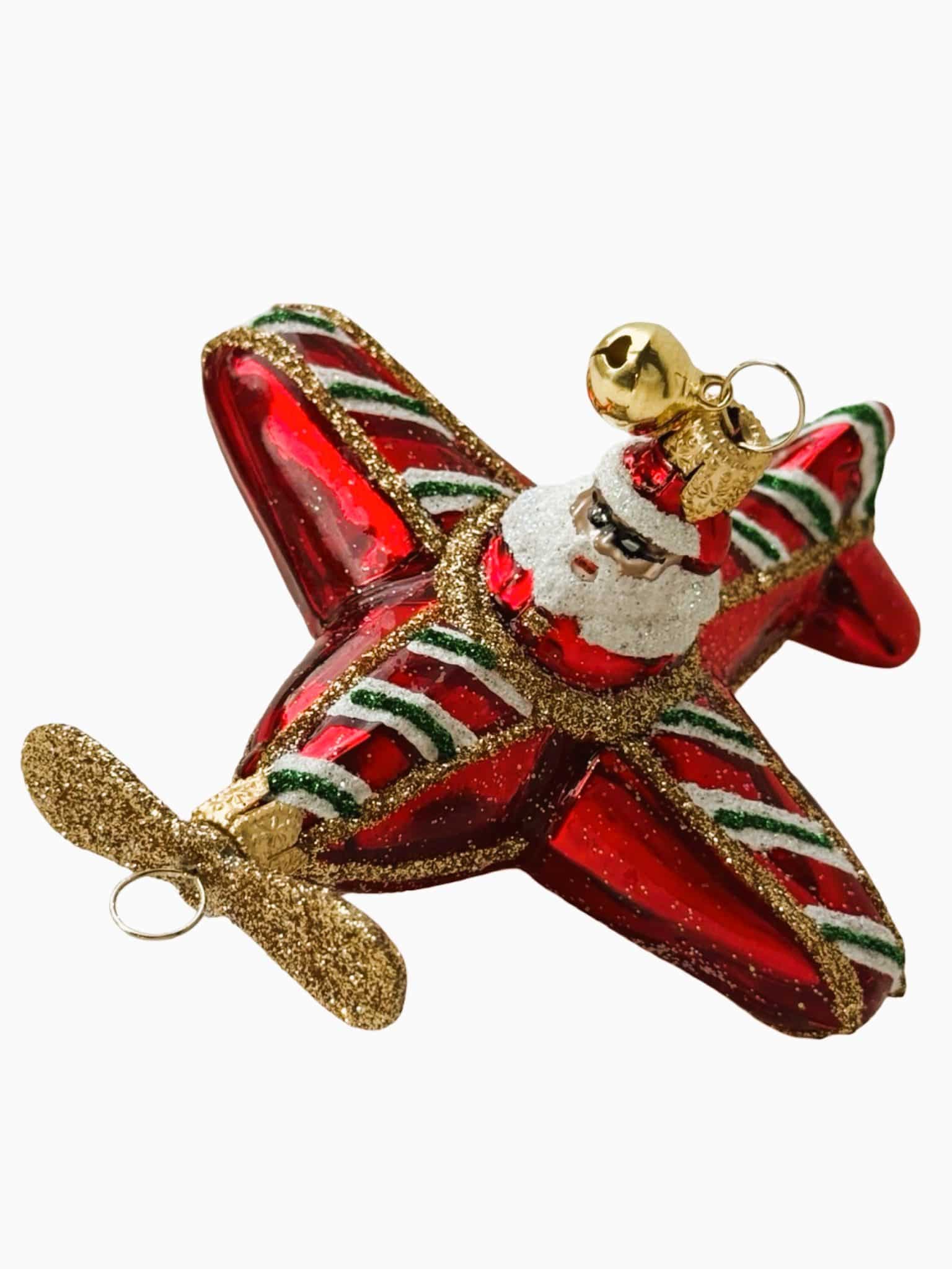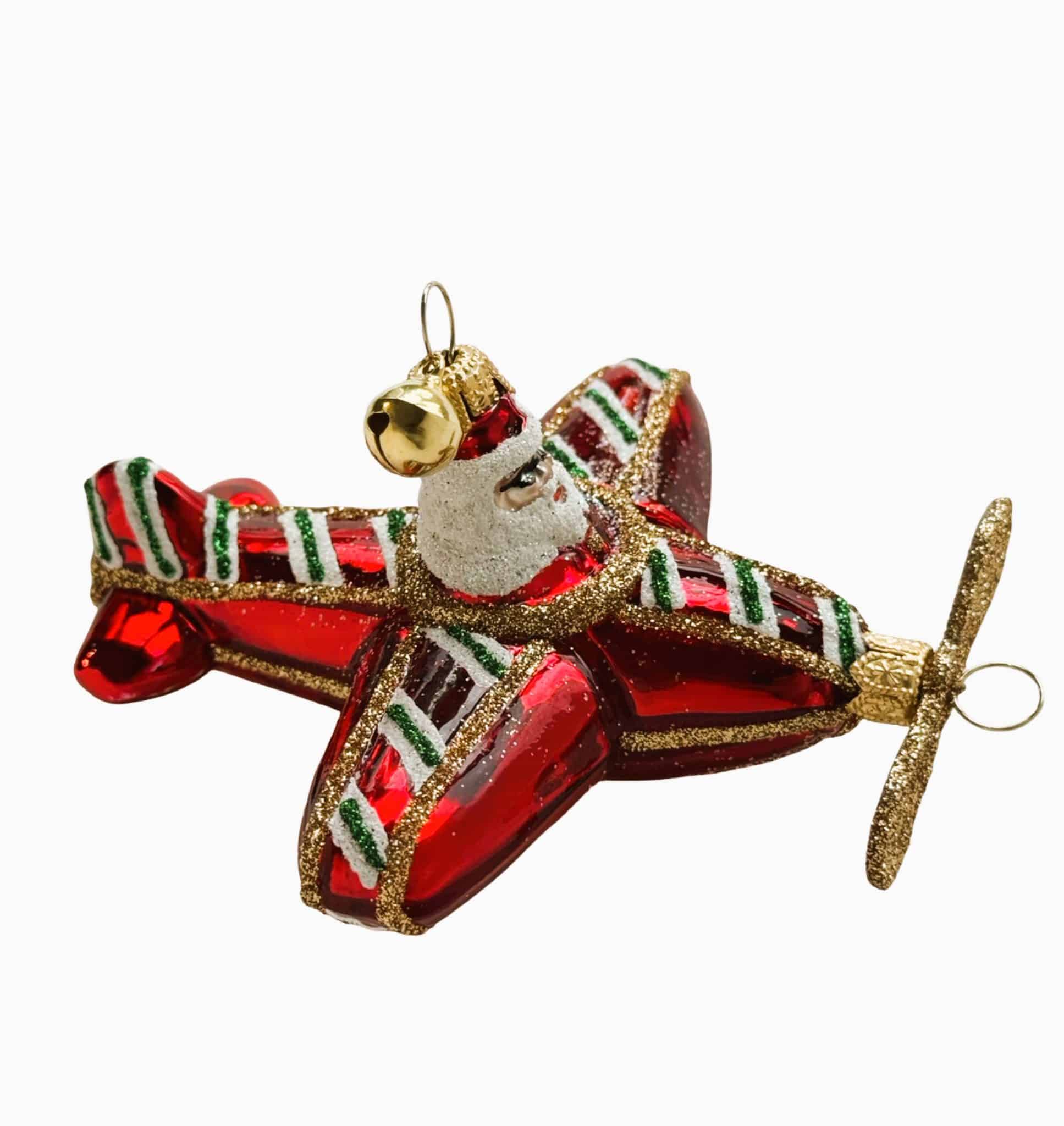 Sterling Silver Lined Hand Blown Glass Santa in an Airplane Christmas Tree Ornament Decoration