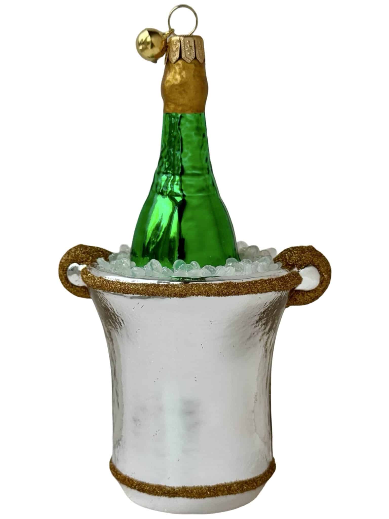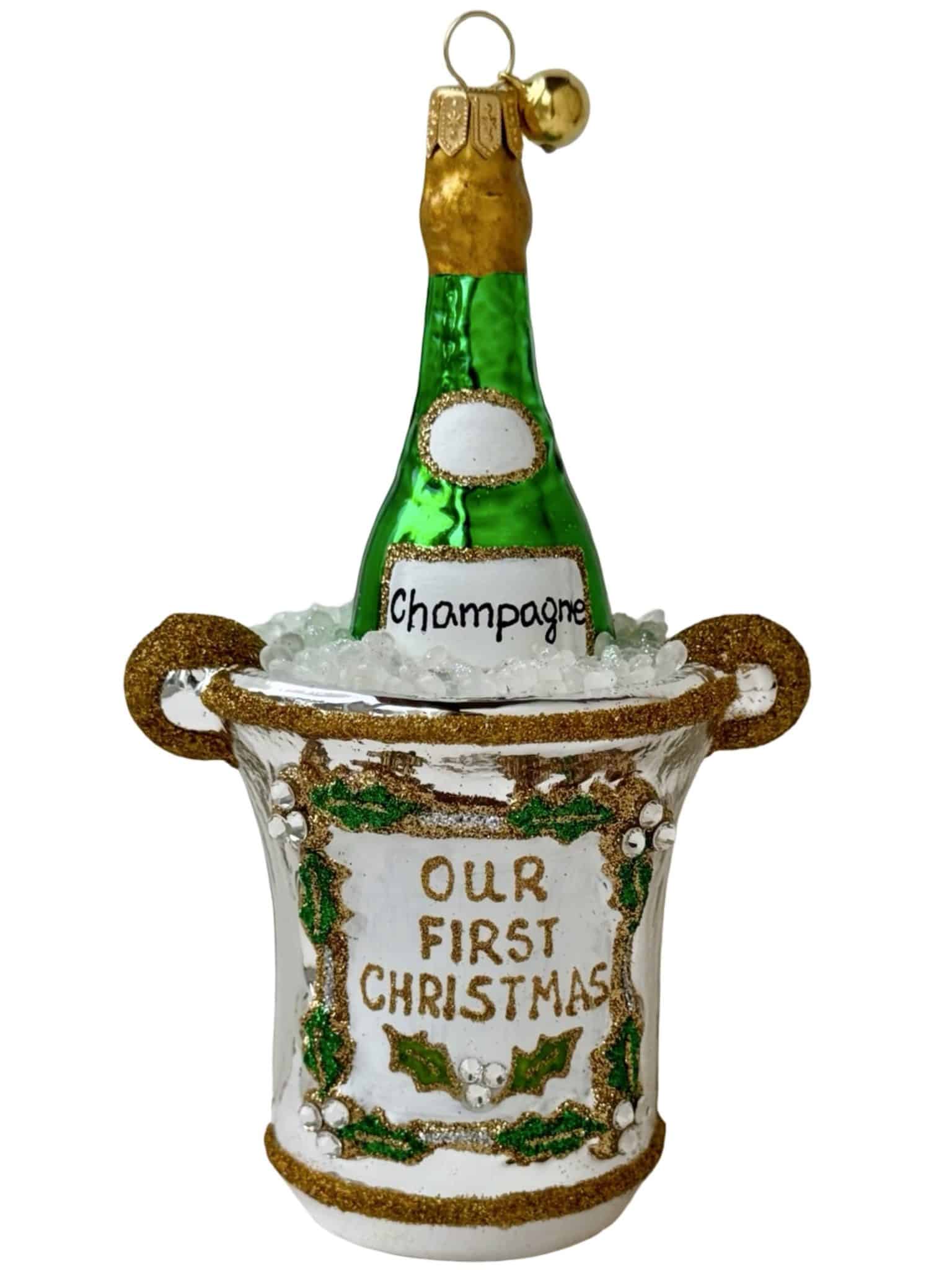 Sterling Silver Lined Glass “Our First Christmas” Green Champagne Bottle in Silver Ice Bucket Ornament