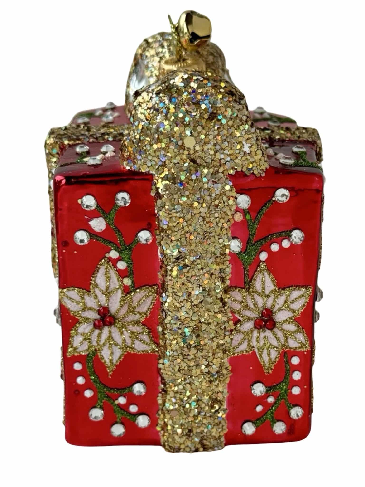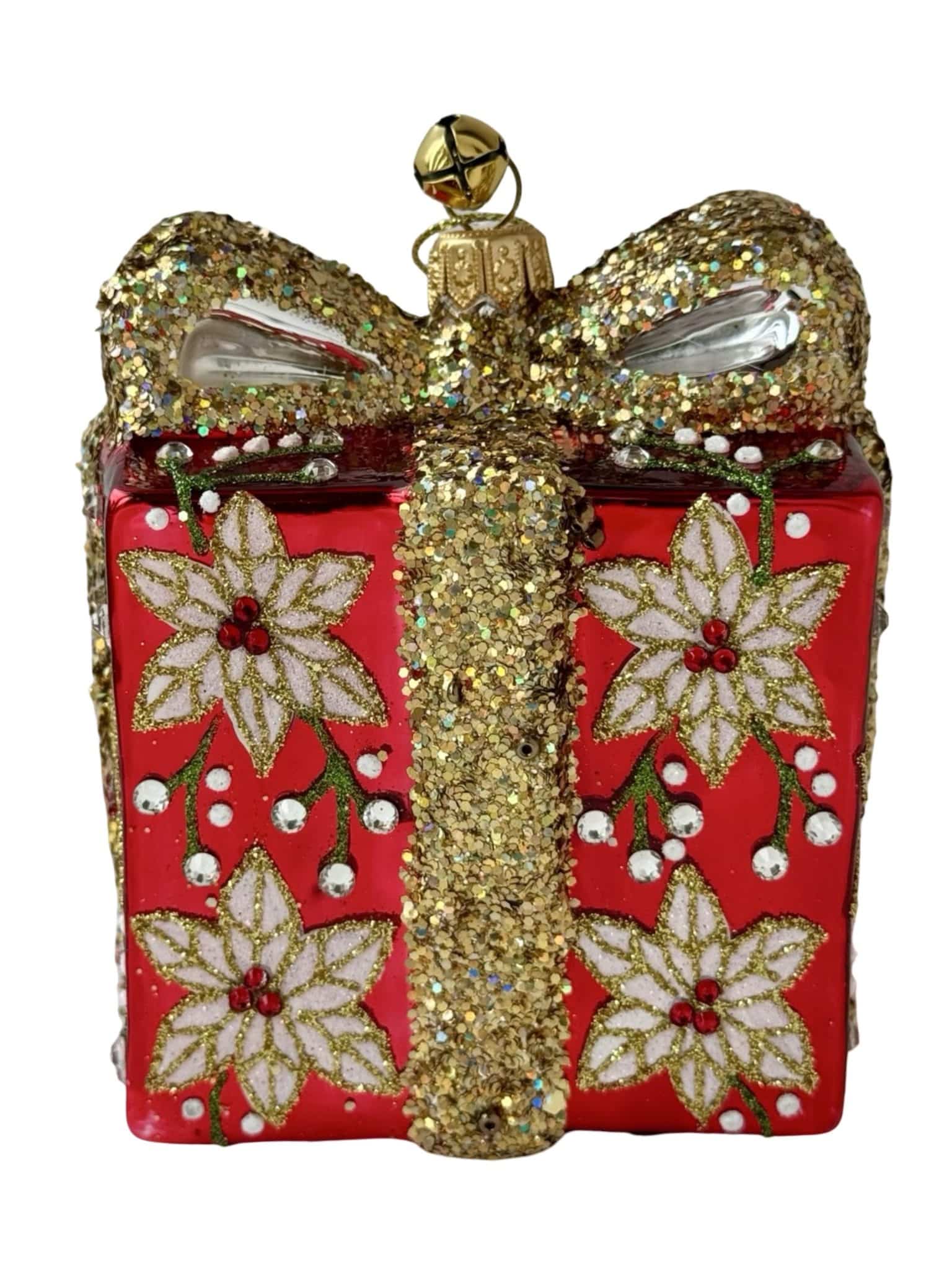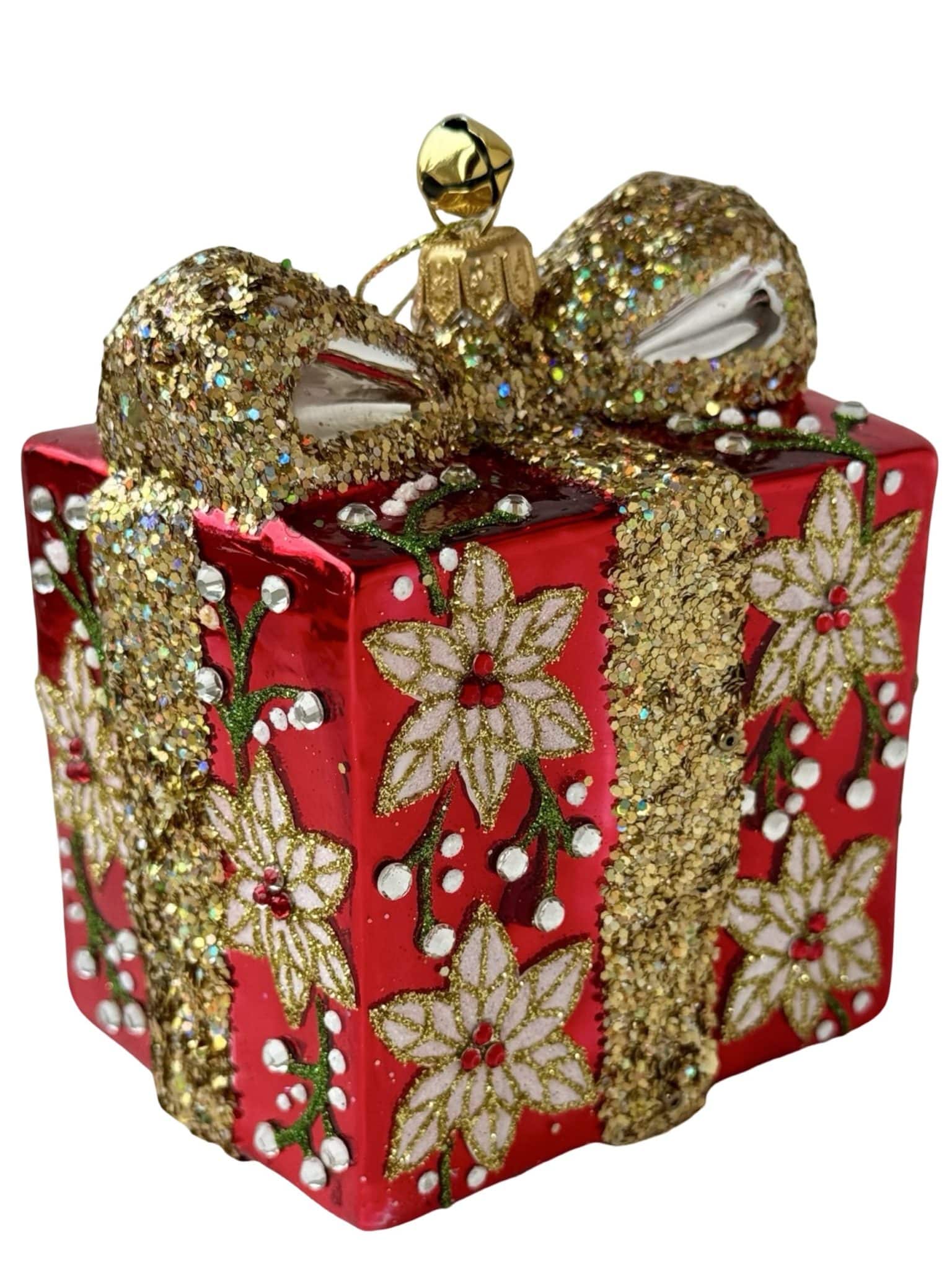 Limited Edition Hand-Painted Red Glass Gift Box Ornament with White Poinsettia Floral Pattern and Gold Glitter Accents