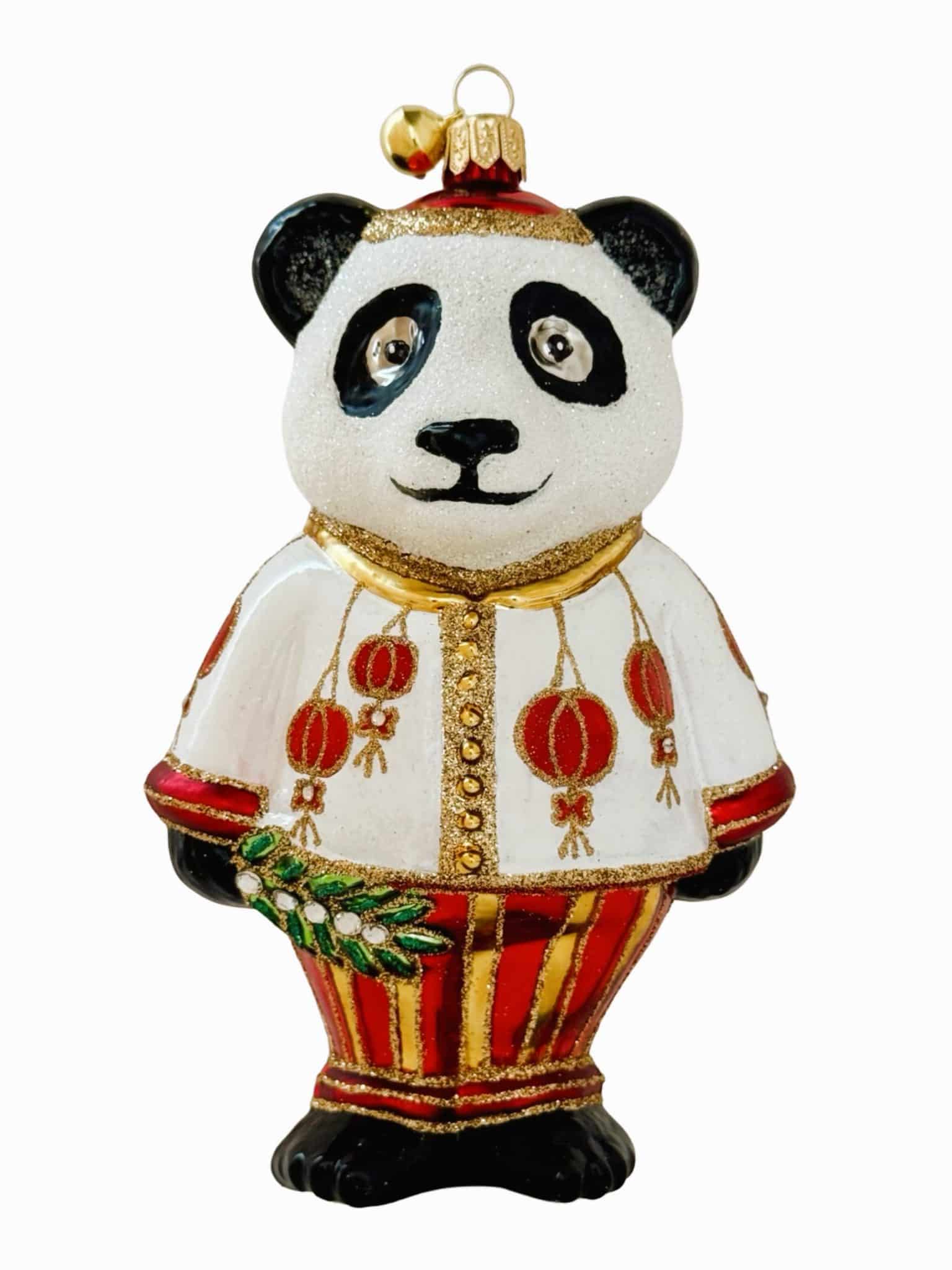 Glass Panda Ornament Wearing a White Coat Decorated with Hand Painted Red Lanterns