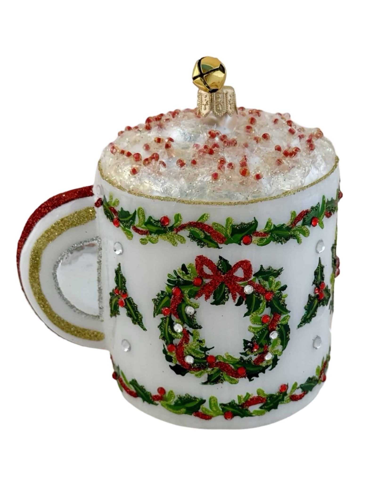 - Fun, Whimsical, Vintage Looking Hand Painted Holiday Wreath Hot Cocoa Cup Christmas Tree Ornament