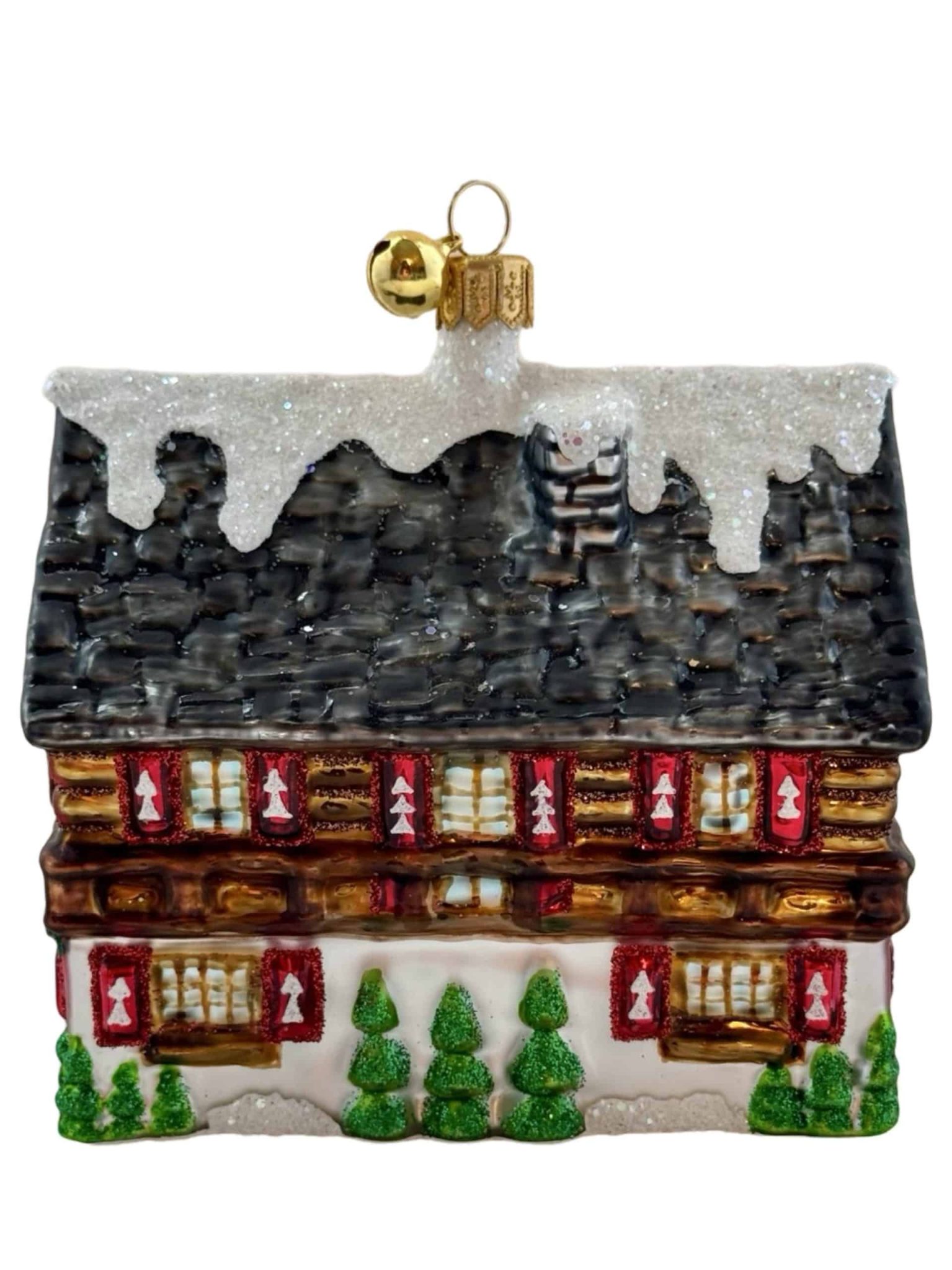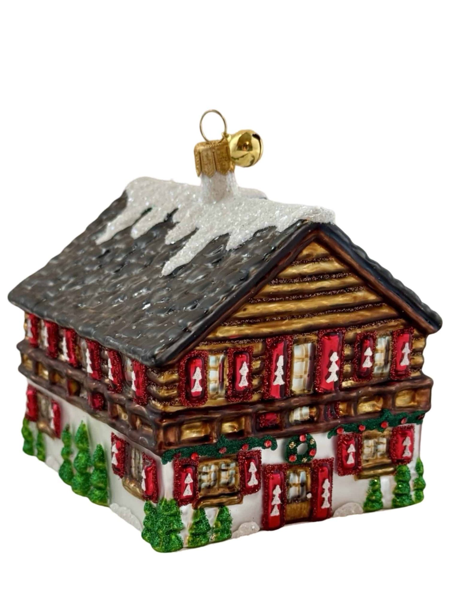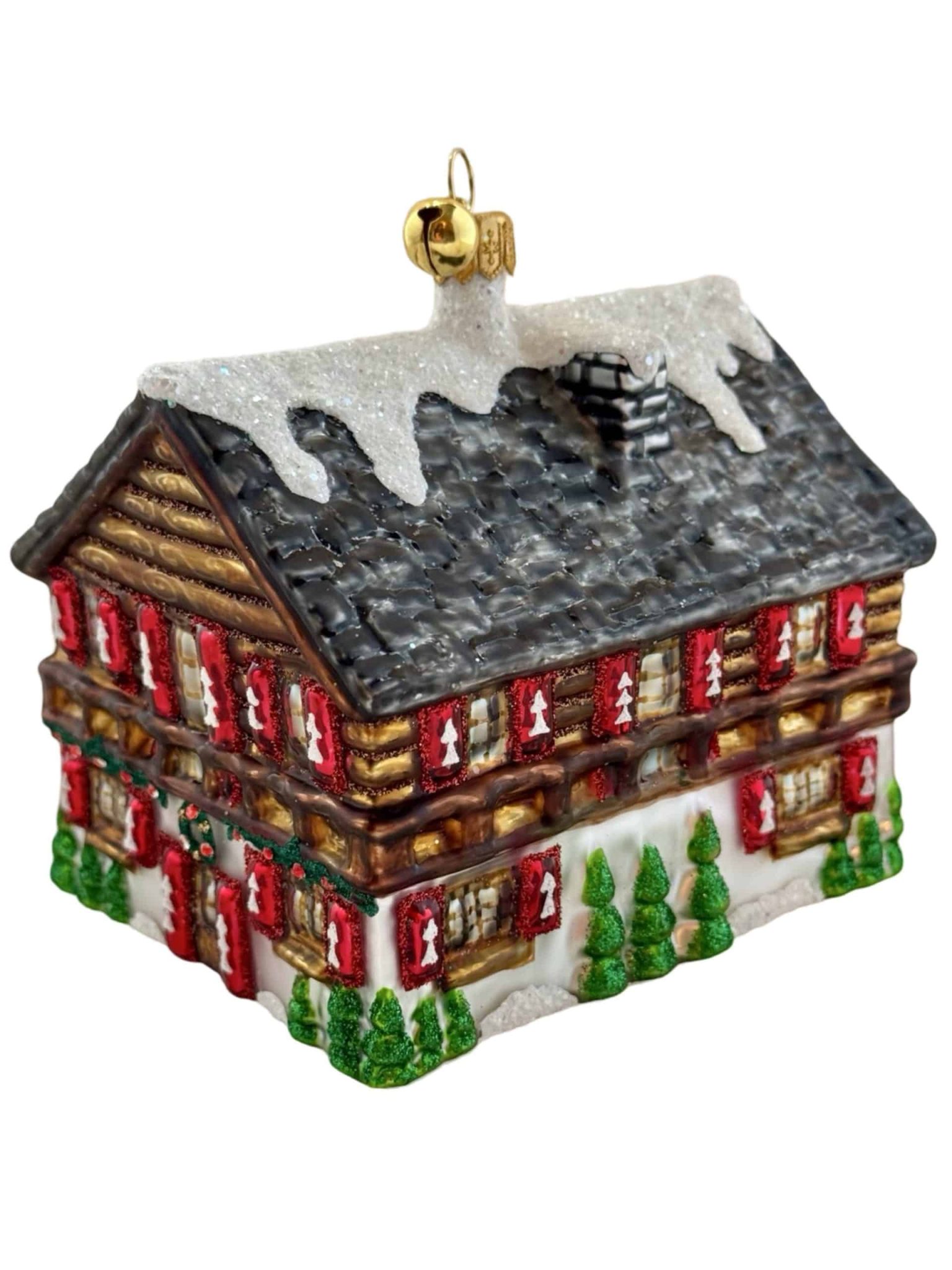 - Snowy Holiday Alpine Cabin Ornament with Hand Painted Woodgrain, Roof and Brick Chimney