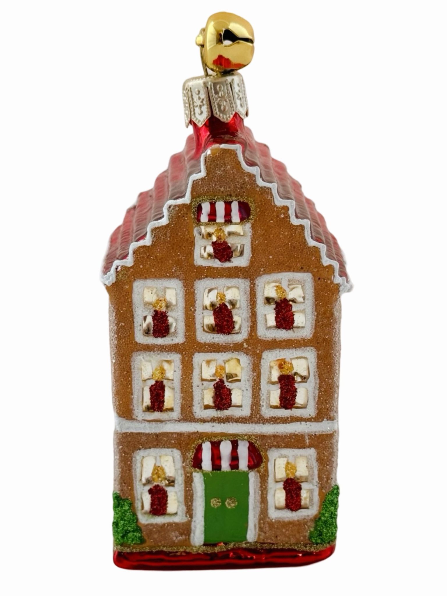 - Whimsical Petite Gingerbread Dutch House with Hand Painted Red and White Striped Awning and Candles in the Windows