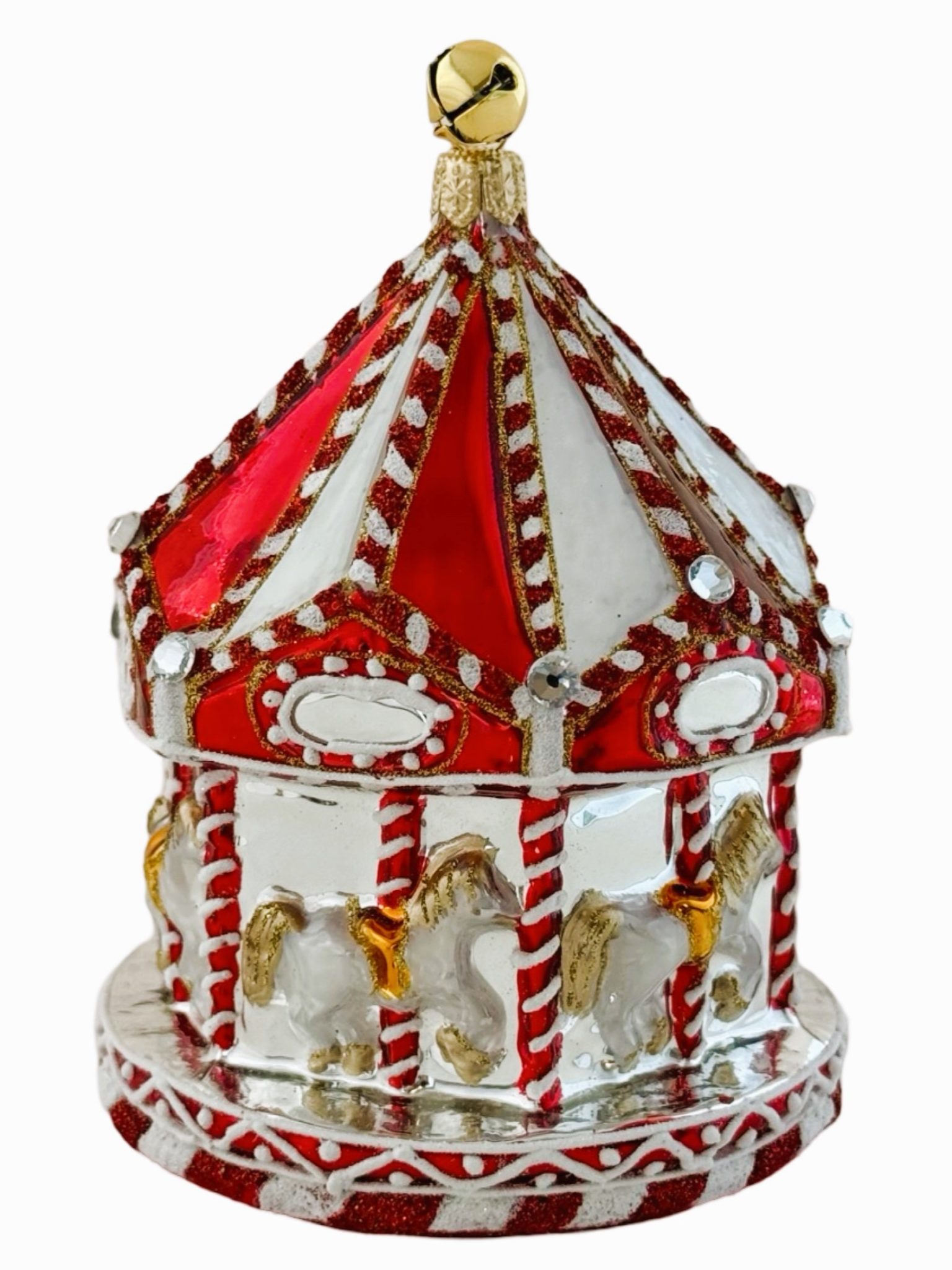 - Hand Painted Red and White Peppermint Carousel Ornament Trimmed with Czech Crystals