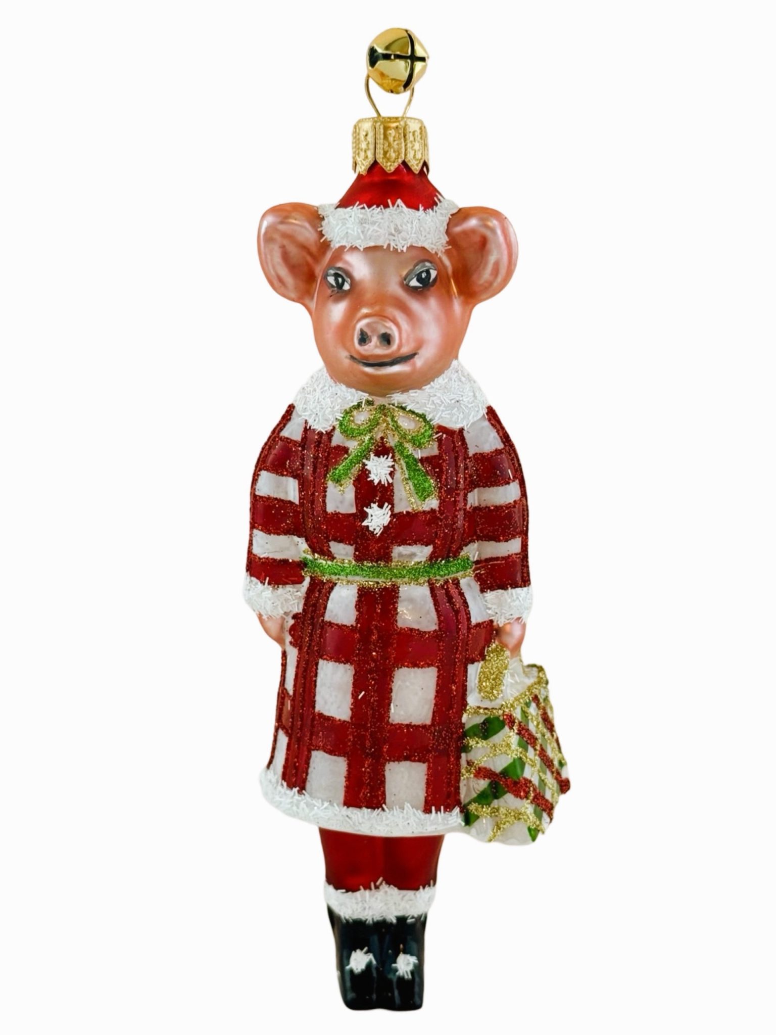 - Festive Hand Painted Pig Ornament Wearing a Plaid Red and White Glitter Holiday Dress and Holding a Christmas Plaid Shopping Bag