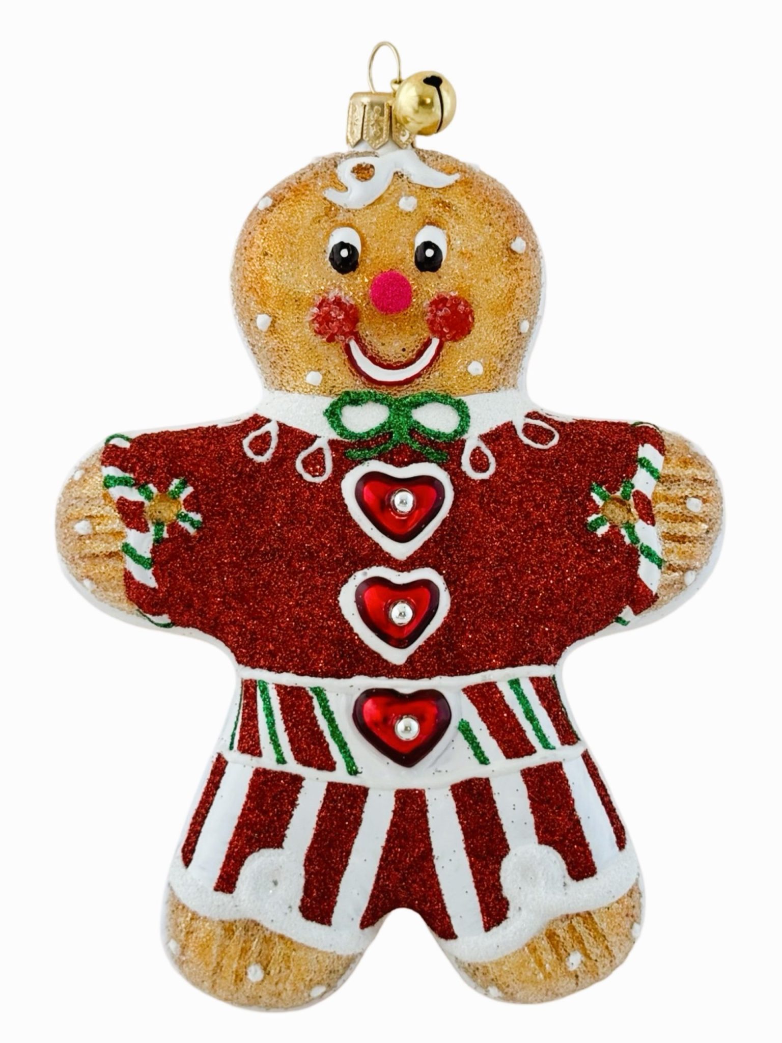- Hand Painted Gingerbread Boy Ornament Wearing a Red Glitter and Peppermint Stripe Patterned Suit Trimmed with Silver Nonpareils and Heart Shaped Buttons