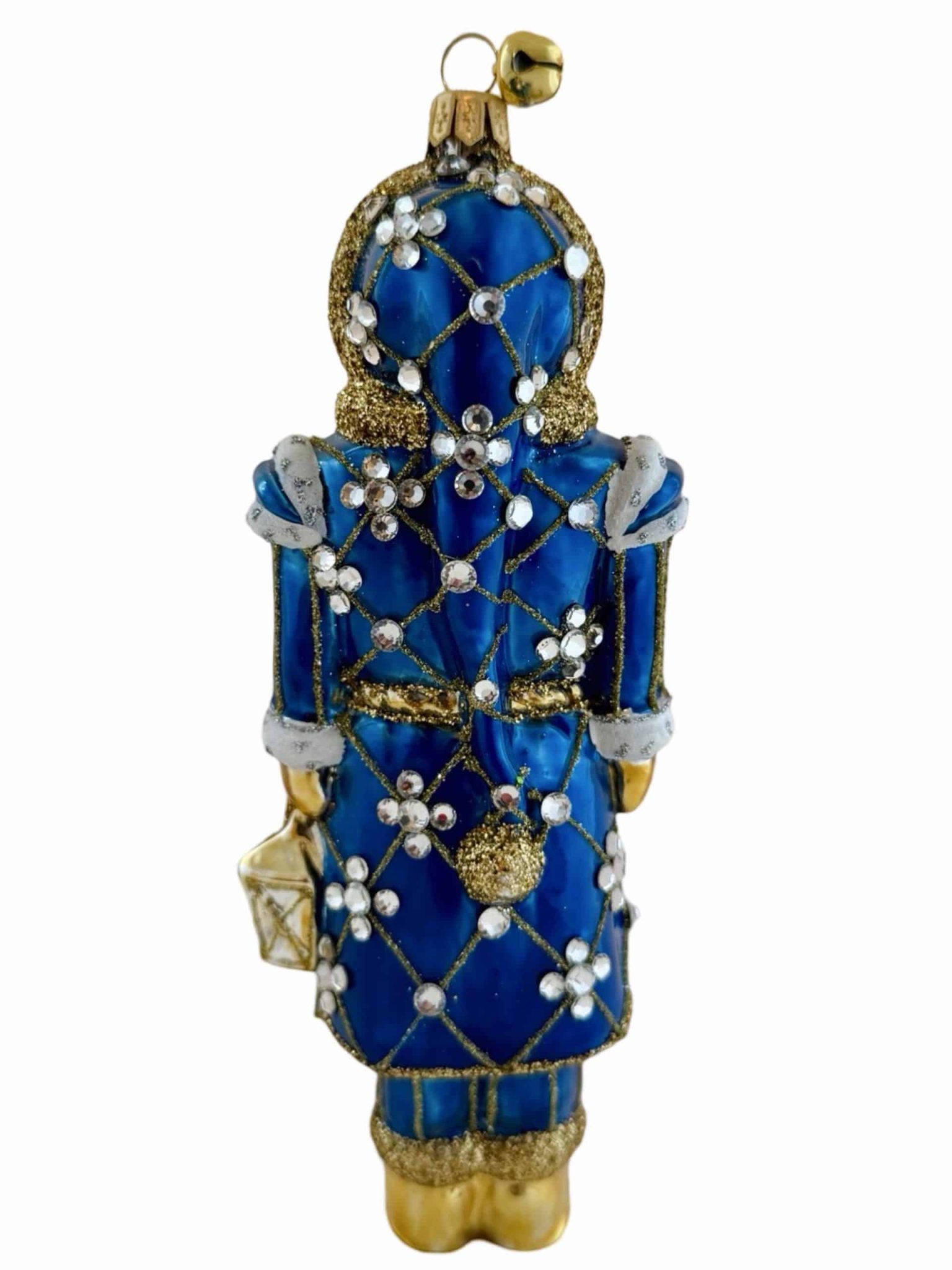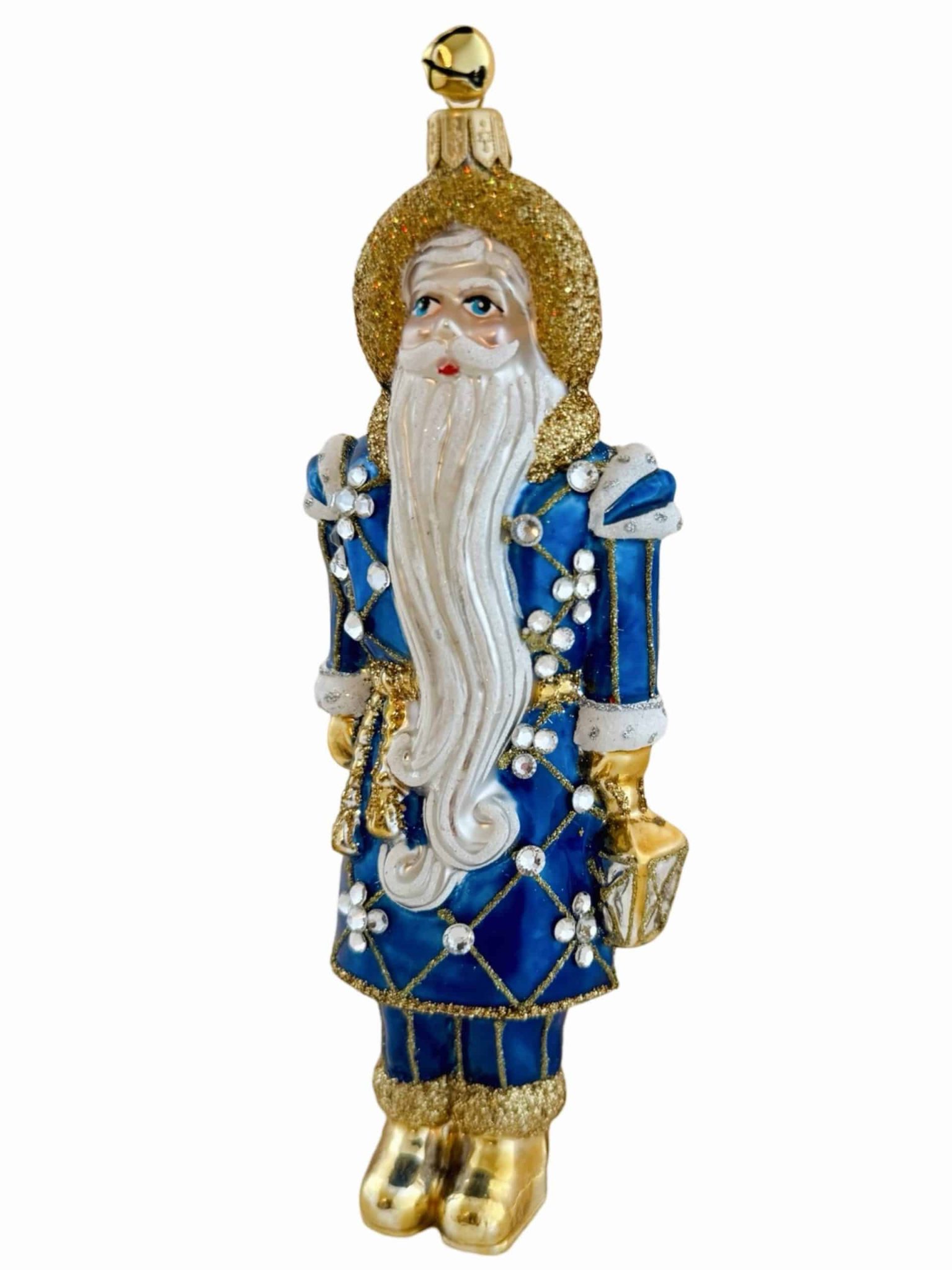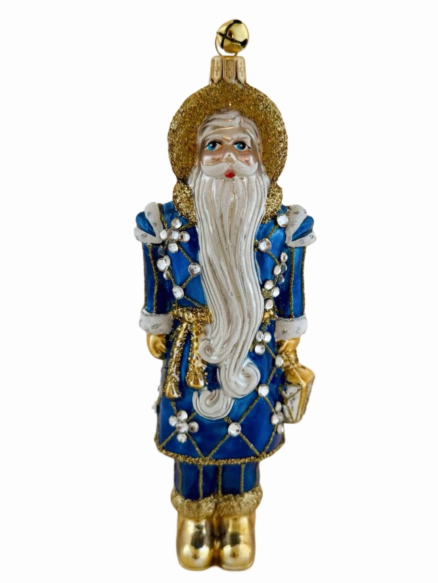 - Unique Keepsake Hand Painted Jeweled Blue and Gold Glitter Coat Santa Ornament