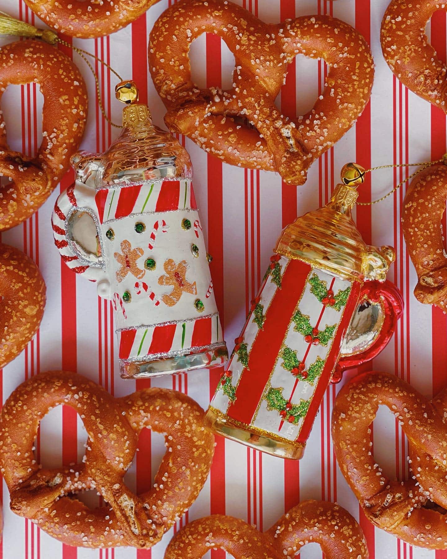 - Fun Traditional German Oktoberfest Beer Stein Ornament with Hand Painted Red and White Stripe Holly Berry Leaf Pattern