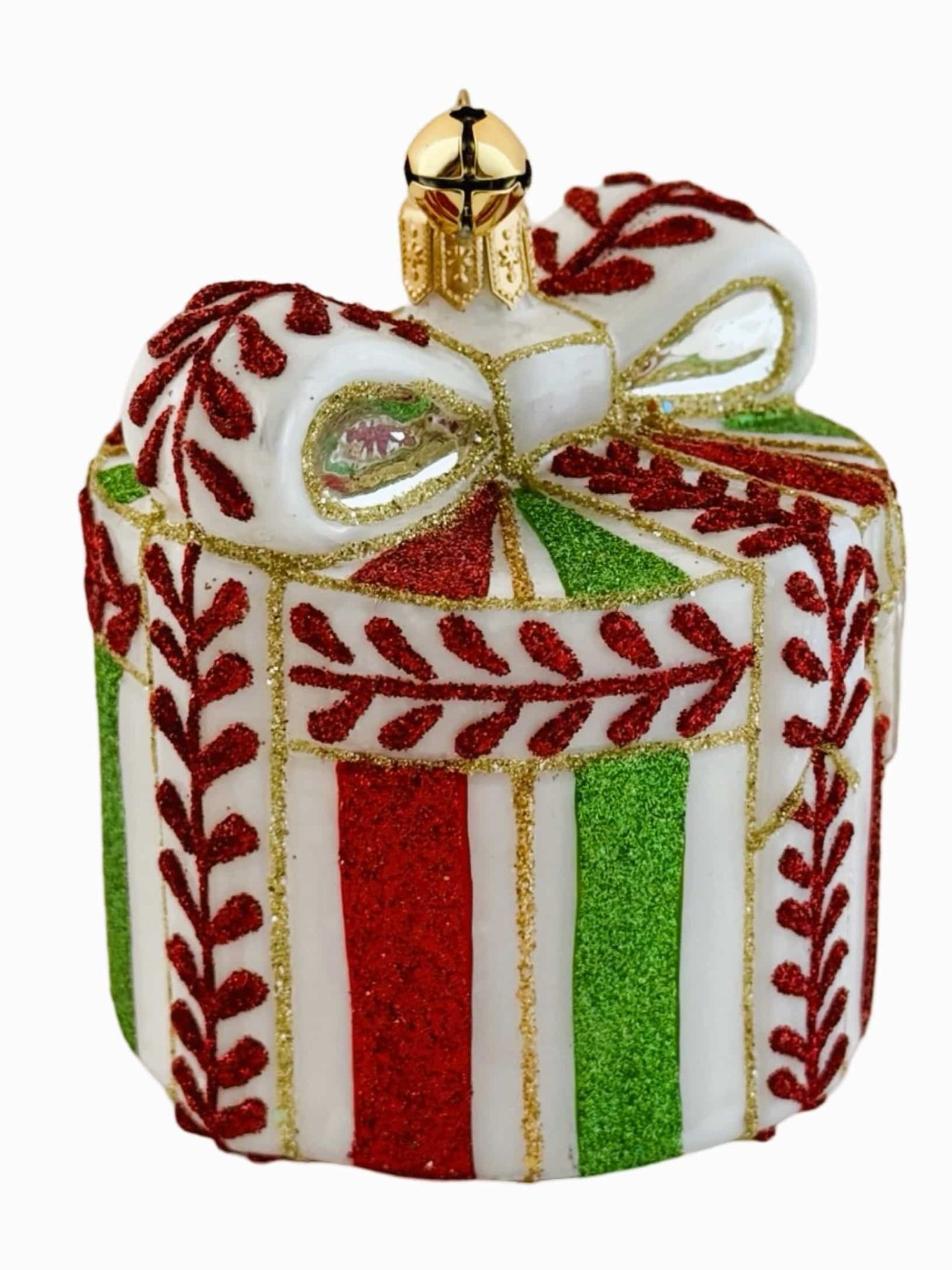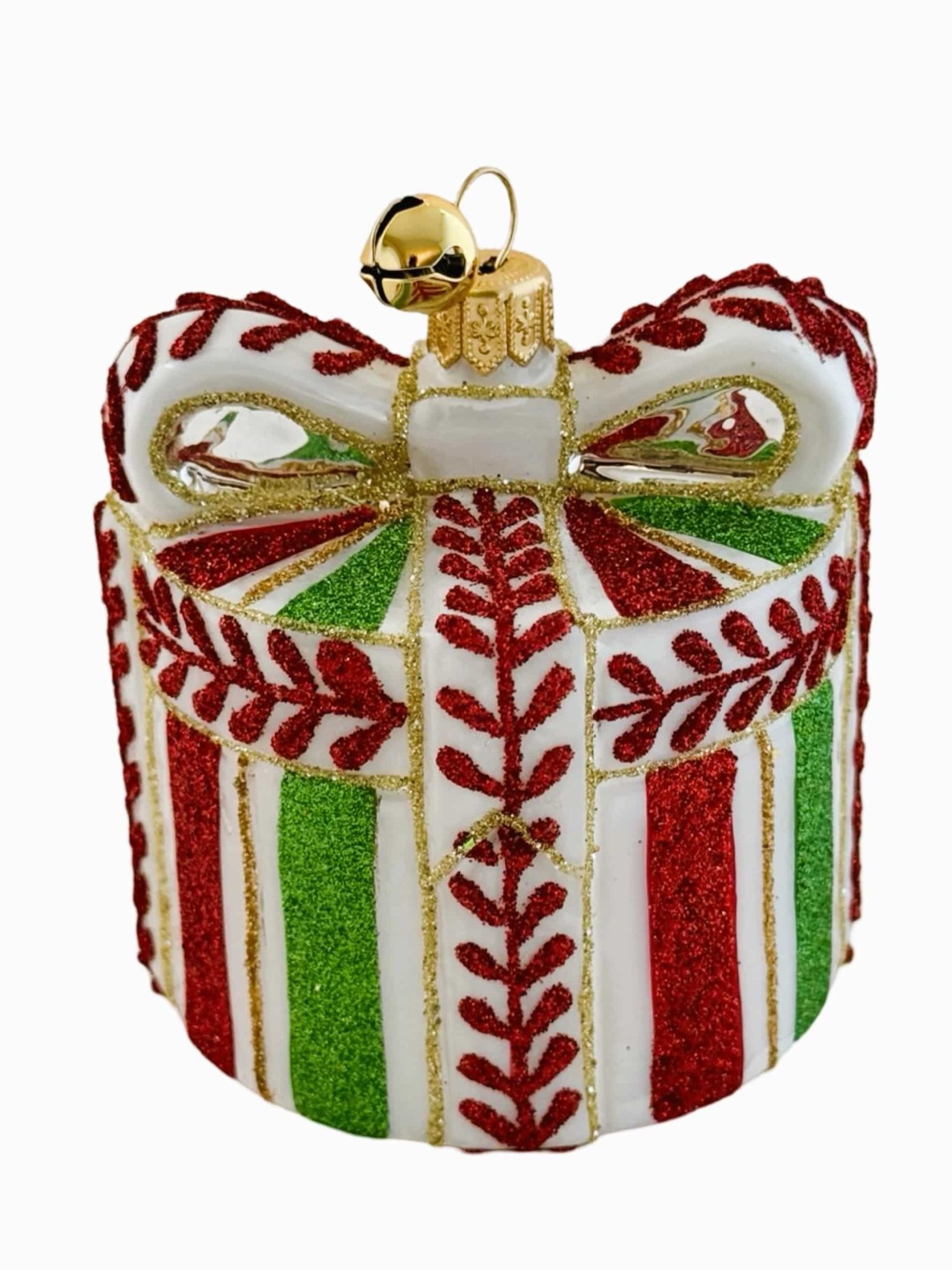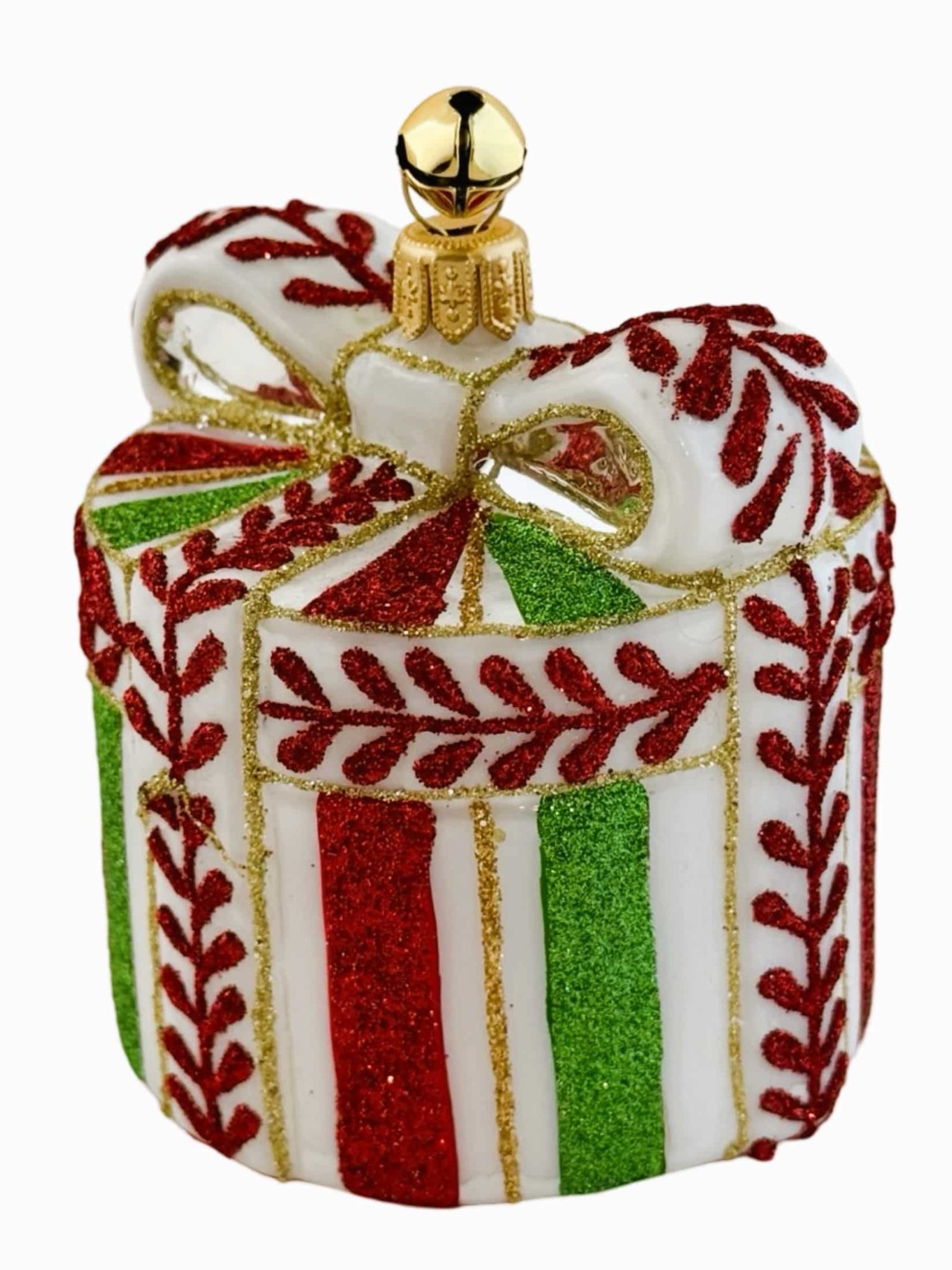 - Festive Red, White and Green Glitter Stripe Patterned Gift Box Ornament